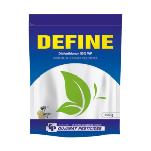 DEFINE (Diafenthiuron 50% WP) belongs to a unique chemical group allowing control of insects and mites resistant to major chemical classes such as OPs or Pyrethroids.